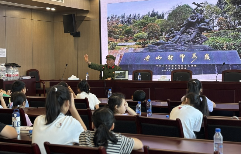 在纪念抗日战争胜利80周年的特殊节点,孩子们迎来了一位特别的“老师”——新城老兵宣讲团成员、对越自卫反击战参战老兵张海平。身着旧式军装、胸前佩戴军功章的张海平精神矍铄,声音洪亮,将孩子们带回到四十多年前的炮火硝烟中。“那一年,我21岁,和战友们写下请战书,毅然奔赴前线……”他用朴实生动的语言,讲述了“啃干粮、喝雨水”的艰苦行军、“猫耳洞里的生死瞬间”,以及“胜利归来却永远失去兄弟”的深沉缅怀。一个个真实的故事,一幕幕鲜活的画面,让抽象的历史变得可感可触。讲到动情处,老人几度哽咽,孩子们也深受感染,稚嫩的脸上写满崇敬,会议室里数次响起热烈而持久的掌声。