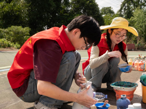 从晨光熹微至夜幕低垂,志愿者们不断将自己的专业知识和红岩特色相融合,颜料沾染了衣襟、汗水浸湿了后背,却无人停下手中的工作,墙前忙碌的每一笔都凝聚着志愿者们对红岩村未来的美好憧憬。