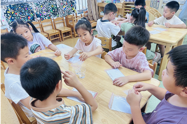 在“创作秘密图案”环节,老师为孩子们分发了棉签、维C粉、水等材料。“大家可以用这些‘隐形墨水’在白纸上画出图案。”老师一边示范,一边讲解原理,“有机物在常温下与纸张纤维结合后无色透明,但遇到特定条件就会‘显形’。”孩子们立刻化身“情报员”,有的画起笑脸,有的写下小伙伴的名字,还有的创作了简易密码图案。