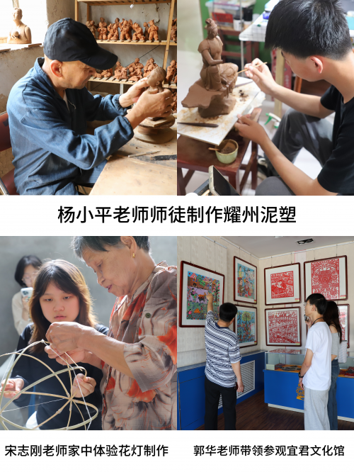 点亮乡土星空,非遗艺术赋能乡村振兴。实践团的足迹并未止步于陈炉。在耀州、宜君等地,团队成员发现,散落乡间的民间艺术如繁星般璀璨,共同点亮了乡村振兴的文化夜空。这些植根于乡土的艺术形式,正通过与节庆经济、文创产业和现代教育的结合,转变为推动地方发展的实在动力,清晰地展示了传统文化在现代社会中强大的经济功能和产业化潜力。在耀州区稠桑村,农民艺术家杨小平的泥塑作品题材均源于鲜活的关中生活;在耀州,以宋志刚为代表的手艺人,将节庆必备的耀州花灯发展为致富产业;在宜君县,“80后”传承人郭华则将剪纸、农民画的元素开发成一系列文创产品,让传统艺术真正“走进生活、融入生活”。这些案例为团队理解“非遗+乡村振兴”提供了鲜活的样本。