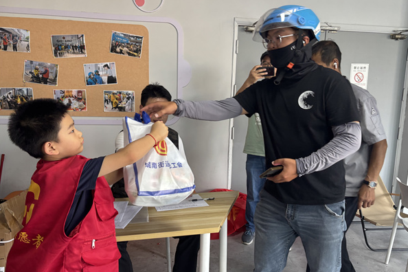 另一边的“清凉礼包”派送区同样热闹。街道提供的清凉礼包整齐排列,打开的瞬间便透出清爽——藿香正气水、风油精等防暑用品一应俱全。小志愿者睿睿给每位骑手送上清凉礼包,骑手们接过礼包时,脸上的汗水与笑容交织,“这礼包太及时了,天热的时候有这些,干活都更有劲儿!”简单的话语里,满是被关怀的温暖。