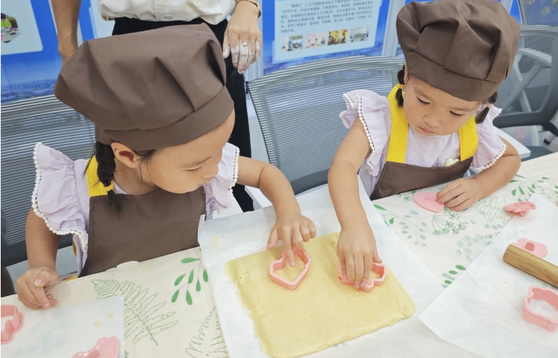 在最受欢迎的造型制作环节,老师分发擀面杖,指导家长如何协助孩子将面团擀成厚度适中的面片。“不要太薄,不然容易烤焦;也不要太厚,不然不容易熟”,老师不时提醒着。孩子们高兴地挑选着心仪的卡通模具,小熊、星星、爱心、小兔子……各式各样的饼干很快铺满了烤盘。