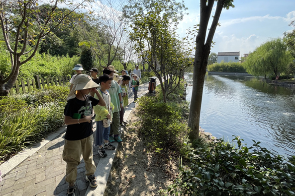 暂别黄亚洲编剧的文化展馆,沿着滨水步道,一堂“行走的生态课堂”开始了!孩子们化身“小河长”,漫步在垂柳拂岸、碧波荡漾的河道旁,“大家知道,这条河以前是什么样的吗?”“不知道!”“这条河在治理前,胥山村的山浜是一条典型的“黑臭河”,自2021年起,胥山村启动了水生态修复项目,构建“水下森林”生态系统,通过种植沉水植物、投放水生动物、设置曝气增氧装置和景观喷泉等方式,大幅提升了水体自净能力。项目还引入了数字信息化监测技术,如水质自动检测微站,实现了对河道水质的实时监测和精准运维。”在颜老师的介绍下,沉浸式地感受水环境治理带来的显著改善。