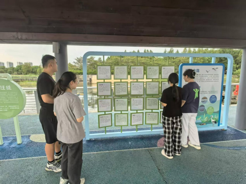 数据采集完成后,实践团召开专题研讨会,对水样检测结果进行多角度分析。检测显示,太湖部分区域水质总体达到Ⅲ类标准,但在航道附近和人为活动频繁区域,总磷和氨氮值略有升高。队员结合取样环境推断,这可能与湖岸带人为排放和水流动力条件有关。讨论中,大家积极提出应加强湖岸带生态拦截、建设植被缓冲带、严格控制旅游污染等治理建议,并撰写初步水质评估报告,提交科学营作为科研参考。除了科研实践,团队也高度重视公众参与和环境教育。实践期间,队员们穿梭在太湖湿地公园的游客聚集区,开展“保护太湖水,从你我做起”主题科普活动。通过宣传单发放、互动问答等形式,向游客介绍太湖的水文特征、生态功能及当前面临的污染压力。许多家长带着孩子驻足聆听,队员们向小朋友演示简易水质检测方法,队员们说:“公众的理解和支持是生态保护能否持续的关键,而我们青年学生应该成为科学与公众之间的桥梁。”此外,实践团还参观了太湖低碳科普走廊。该走廊通过实物模型、图文展板和多媒体交互等形式,全面展示了太湖地区在湿地固碳、水资源循环利用、绿色产业转型等方面的措施与成效。同学们进一步认识到湖泊保护不仅关乎水质本身,更涉及区域经济模式、能源结构及公众生活方式等多重维度,必须通过“湖岸联动”实现系统治理。