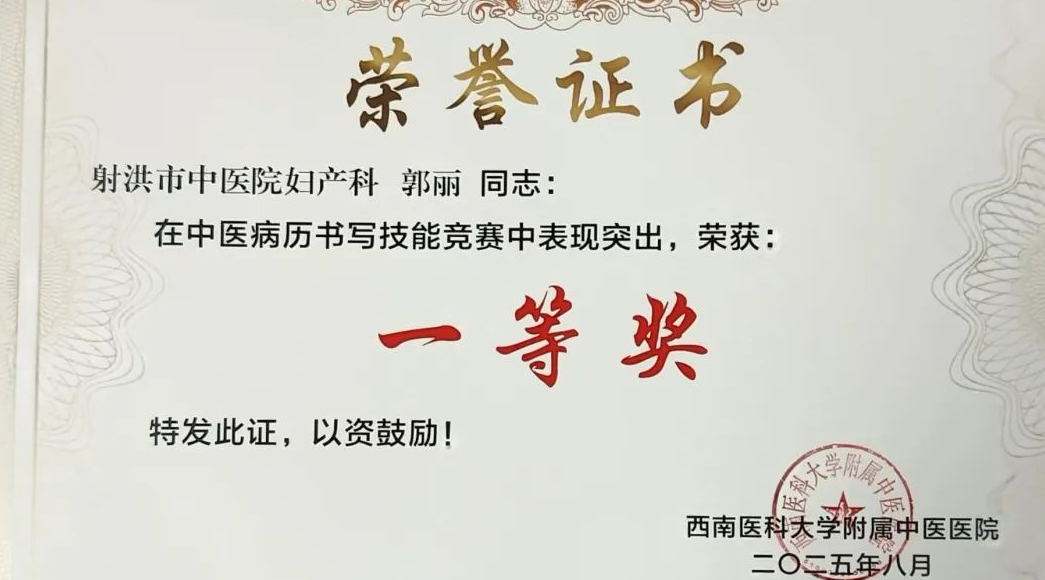 比赛过程中,郭丽同志展现出扎实的中医理论功底和严谨的临床思维。她的参赛病历从患者主诉、现病史到望闻问切记录,从辨证分型、病机分析到治法方药,均严格遵循规范,内容详实、逻辑清晰。此次获奖,不仅是对她个人专业能力的认可,更是射洪市中医院重视中医传承与临床技能培养的成果体现。8 月 19 日,主办方正式公布竞赛结果,对郭丽同志的优异表现予以表扬,并为其颁发荣誉证书。