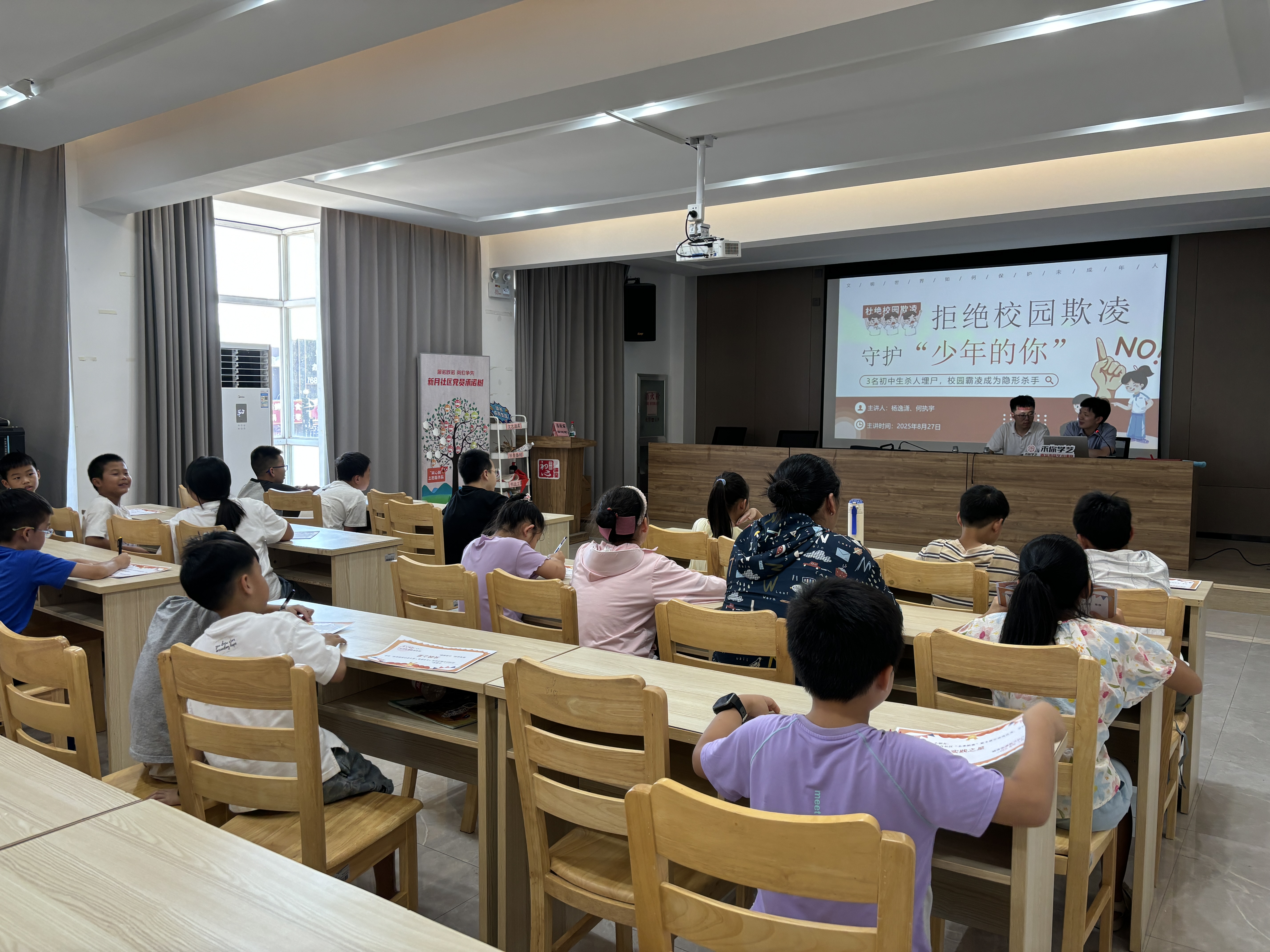 在暑期这趟充满欢乐与成长的旅程里,工作人员始终用镜头默默守护,用照片将青少年们专注探索的模样、肆意欢笑的瞬间、互帮互助的温情定格。而夏令营的最后一课,更添了一份特别的意义:来自浙江甚昶律师事务所的杨律师和何律师,特意在结营仪式上为青少年们带来了预防校园欺凌专题讲解,为青少年的成长筑起了一道温暖的“防护墙”。随后,工作人员通过PPT和视频带领青少年们回顾了暑期的每一场活动。大屏幕上一张张的笑脸、一个个投入的身影,瞬间唤醒了所有人的共同记忆。为了肯定青少年的成长与蜕变,社区从表现突出的青少年中,精心评选出“实践之星”。这份荣誉,不仅是对青少年积极参与每一场活动、勇于尝试每一次挑战的肯定,更是对他们在实践中探索新知、在体验中收获成长的最佳褒奖。