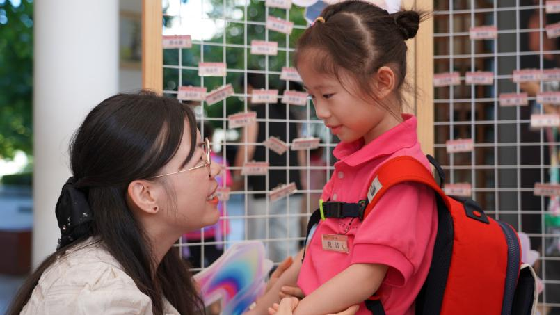 找到姓名牌后,班主任亲手将它别在孩子的左胸前,笑着说“欢迎加入我们班”。小小的姓名牌,不仅是身份的象征,更像一把钥匙,帮宾宾虹虹们打开了“班级小家”的大门,让他们瞬间有了归属感。
