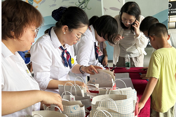 除了文具礼包,物业还特别设置了包书纸服务点。如果业主家中新书已发放,可带孩子至礼品领取处,由物业人员现场协助包书。孩子们围坐在一起,专注地看着物业工作人员为课本“穿上新衣”,眼中充满了惊喜与期待。这一贴心服务不仅解决了家长的实际需求,也增强了亲子之间的互动与情感交流。