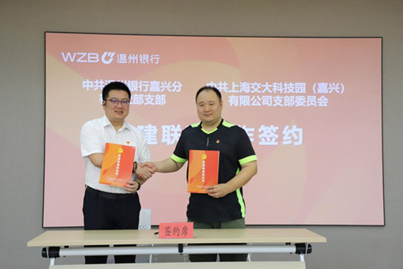 8月27日上午,温州银行嘉兴分行营业部支部与上海交大科技园(嘉兴)有限公司支部委员会在上海交大嘉兴科创园成功举行党建联建签约仪式。本次活动以“党建引领、资源共享、合作共赢”为主题,旨在通过基层党组织间的深度交流,构建银企合作新平台,共同探索科技金融新模式,助力地方经济高质量发展。