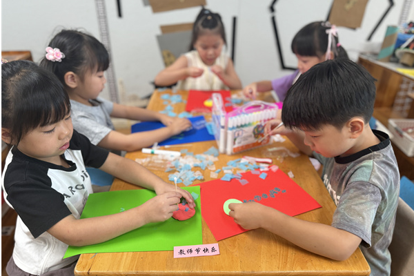 随后的“变废为宝献恩师”环节将气氛推向高潮。值此教师节临近之际,社区工作人员提前备好洁净的过期口罩、粘土与剪刀,手把手教孩子们制作“环保花”。孩子们认真裁剪、细心粘合,灵巧的小手让废弃口罩绽放成一朵朵形态可爱的花朵。“张老师,这朵花送给您!”“老师,节日快乐!”活动现场,孩子们捧着亲手制作的环保花奔向老师,稚嫩的祝福与真挚的笑容,让老师们暖意满满。