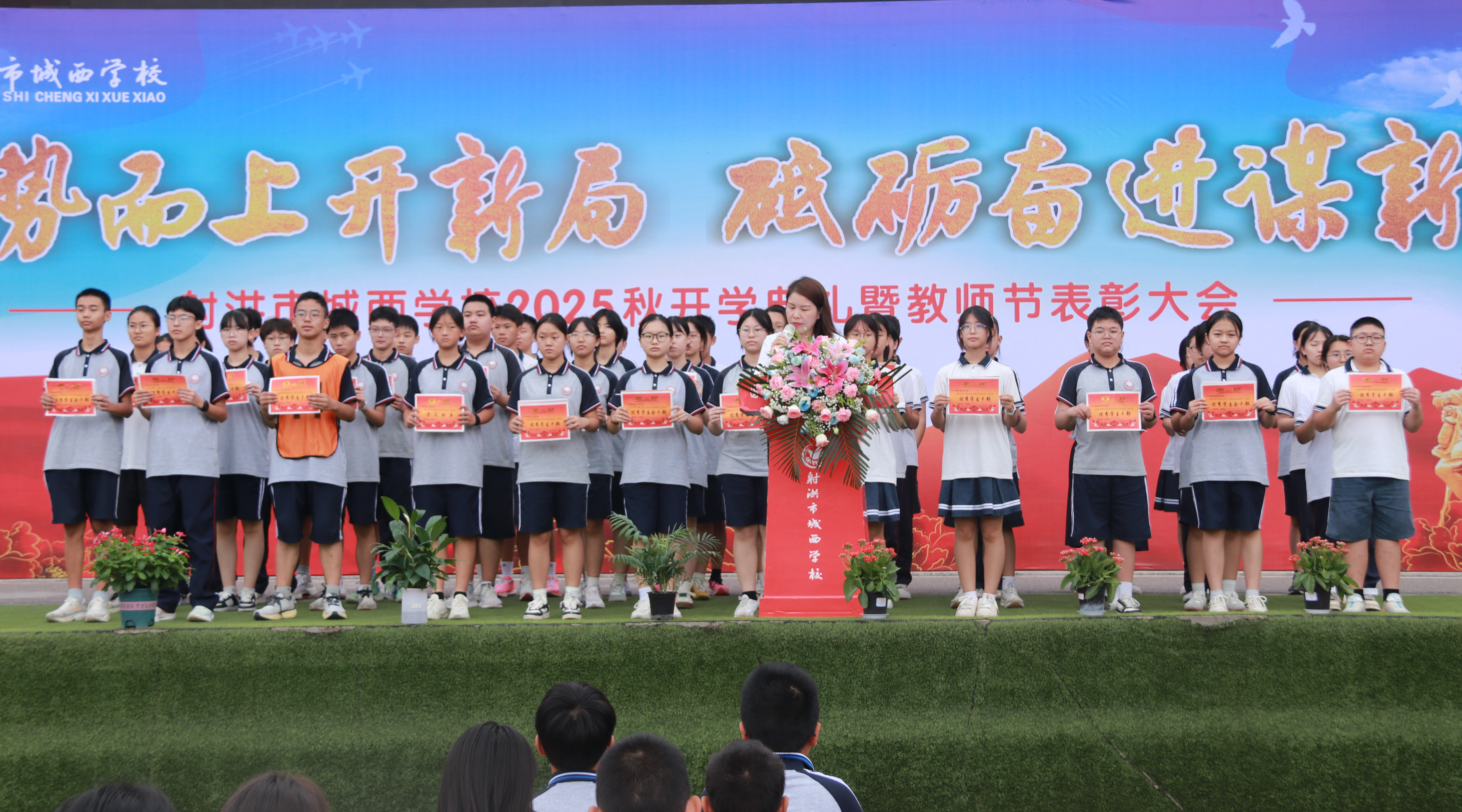 “致敬杏坛”环节中,谭洪兵副校长宣读2025年春季优秀教师获奖名单,获奖教师代表上台领奖,现场掌声为教育楷模加冕;新教师代表苏丽玮发言,分享对教育事业的赤诚与期待,彰显城西教育薪火传承的力量。