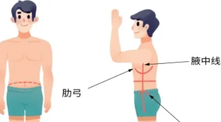 姿势:站立,呼吸均匀,直视前方,放松腹部,双臂自然下垂,双脚并拢;定位:找到肋弓下缘与髂嵴连线中点(侧腰中点),标记后绕腹一周;测量:软尺贴皮肤、不勒紧,在平静呼气末读数;若定位困难,可在肚脐上方1–2 cm处水平测量。