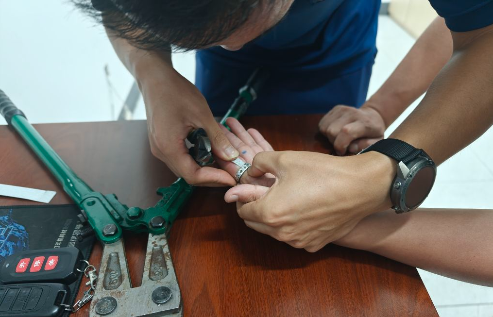 近日,嘉兴经开区塘汇街道应急消防管理站来了一位焦急万分的群众,手指被戒指卡住无法取下,已出现明显肿胀。为避免在破拆戒指的过程中造成二次伤害,经验丰富的消防队员用薄垫片插入戒指与手指间做好隔离防护后进行剪切。“咔擦”戒指顺利从群众手指上取下,收获居民的连声感谢。
