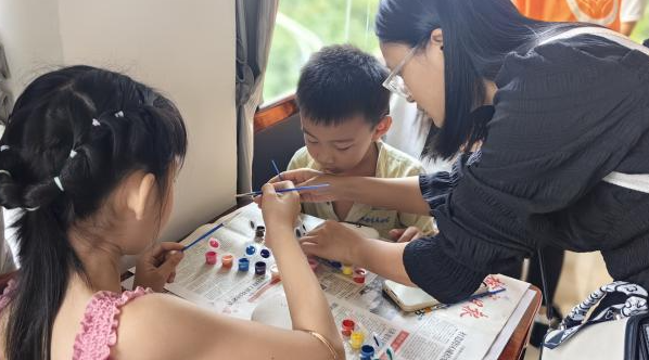 过程中,讲师和志愿者们穿梭在孩子们中间,随时提供帮助:帮握笔不稳的小朋友调整姿势,给色彩搭配纠结的孩子出主意。家长们也忍不住在旁协助,有的递纸巾,有的帮忙挤颜料,亲子间的互动温馨又有爱。