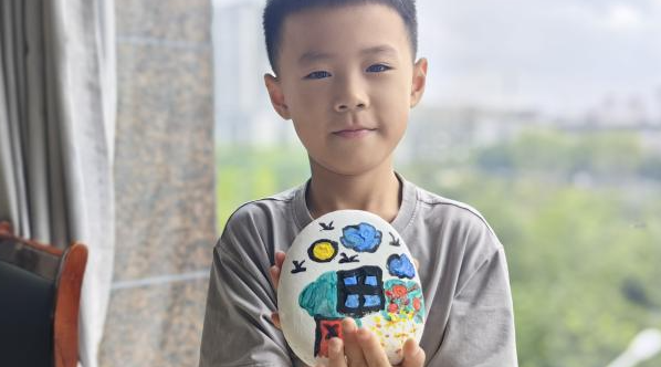 经过一个多小时的精心创作,原本不起眼的鹅卵石全都变身成了独一无二的“艺术品”。在作品分享环节,孩子们捧着自己的石头彩画,自信地介绍起来:“我画的是小房子,有绿色的草地,有大大的太阳!”“这是我给妈妈画的西瓜,希望妈妈每天都开心!”一张张稚嫩的脸庞上满是骄傲,现场掌声不断。
