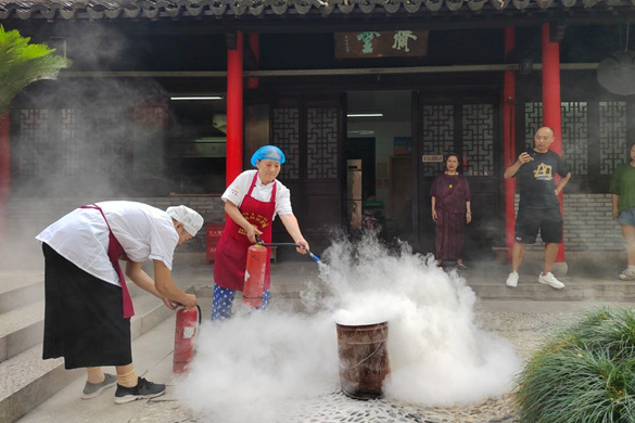 第三阶段为实操演练。社区微站人员在觉海寺演练模拟初期火灾扑救,通过对寺庙管理人员讲解灭火器“提、拔、握、压”四字使用方法,指导湿毛巾捂住口鼻、低姿快速通过浓烟区等逃生技巧。从报警、疏散到灭火,组织全员分组实操,以确保大家都能独立完成灭火操作,掌握基本的消防技能和疏散逃生技巧。