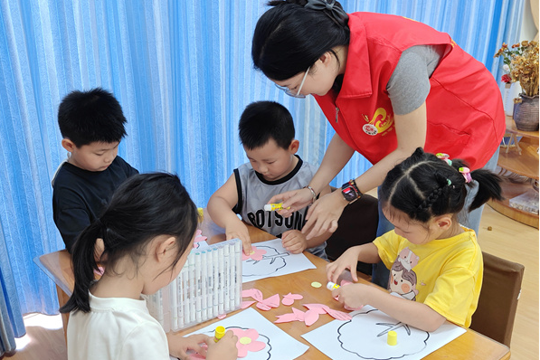 在活动实践环节,志愿者提前将彩色废纸剪裁成花瓣、花蕊形状,孩子们在指导下用胶棒将粉色花瓣、黄色花蕊拼贴成花朵,再粘贴到画有大树轮廓的A4纸上。随后,他们用马克笔为大树添上枝叶、蝴蝶和彩虹,创作出独一无二的“环保生态画”。“我画了小鸟,它们在天上飞!”“看,我的大树结果子啦!”……孩子们举着作品兴奋展示,稚嫩的笑脸与五彩斑斓的画作相映成趣,成为一道充满童真与想象力的亮丽风景线。