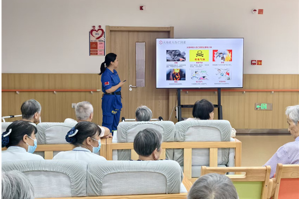 活动伊始,蓝天救援队的消防教官以“老年人消防安全防护”为主题,结合养老院人员密集、老人行动不便等特点,通过通俗易懂的语言和真实案例,开展消防安全知识讲解。教官重点围绕火灾成因、日常防火注意事项、初期火灾扑救方法、火灾逃生技巧等内容展开,尤其针对老年人在用电、用火、用气过程中的常见安全隐患进行细致提醒,例如“离开房间及时关闭电源”“发现烟雾要第一时间呼喊求助”等实用知识点,还通过问答互动的形式,引导老人们主动思考、积极提问,现场氛围热烈,有效加深了大家对消防安全知识的记忆与理解。