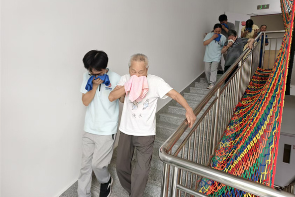 “呜——呜——”随着一阵急促的火灾警报声响起,逃生演练正式开始。模拟场景设定为养老院二楼房间突发“火情”,现场迅速产生烟雾。在蓝天救援队教官和养老院工作人员的指引下,老人们用湿毛巾捂住口鼻,弯腰低姿,沿着墙壁有序向楼下安全区域疏散。考虑到部分老人行动不便,工作人员提前一对一结对,搀扶行走,确保每一位老人都能安全撤离。整个演练过程紧张有序,从警报响起至所有人员疏散至安全区域,仅用时6分钟,充分检验了养老院应急预案的可行性,也让老人们在实战模拟中掌握了正确的逃生方法。