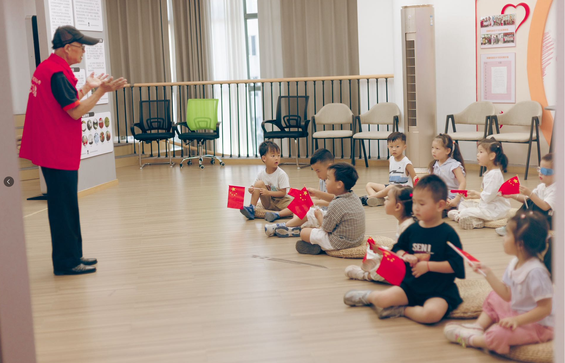 活动现场热闹非凡,红色教育氛围尤为浓厚。社区特别邀请南湖初心讲师余锡九老师,为孩子们带来生动的红色课堂。余老师以少年抗日英雄的故事为主线,生动讲述 “鸡毛信” 的传奇经历,将革命先辈的勇敢与智慧娓娓道来。孩子们手持鲜艳的国旗,眼神专注,认真聆听着那段波澜壮阔的历史,爱国情怀在心中悄然扎根。现场飘扬的国旗与孩子们稚嫩的脸庞相映成趣,浓厚的喜庆与红色氛围感染着在场每一位参与者。