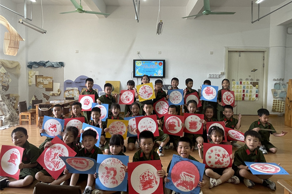 接着,她讲起中秋玉兔、嫦娥奔月的传说,并拿出拓印模板:红旗、玉兔、圆月……孩子们把海绵小滚筒蘸上颜料,“啪”一声按下,把“我爱中国”和“中秋团圆”一并拓在画纸上。小小拓印,拓下的是节日符号,也是一颗颗稚嫩的“中国心”。