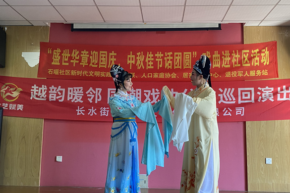9 月 26 日,嘉兴蕊鑫文化传媒有限公司为居民奉上越剧、黄梅戏等精彩演出,带来另一番视听盛宴。《闯宫》《郎对花》等经典剧目的选段轮番上演,演员们细腻的表演、优美的身段,将戏剧的柔美与典雅展现得淋漓尽致。“演员们的唱腔太动听了,演得也很投入,感觉就像在看完整的大戏!” 来看演出的居民王阿姨兴奋地说。