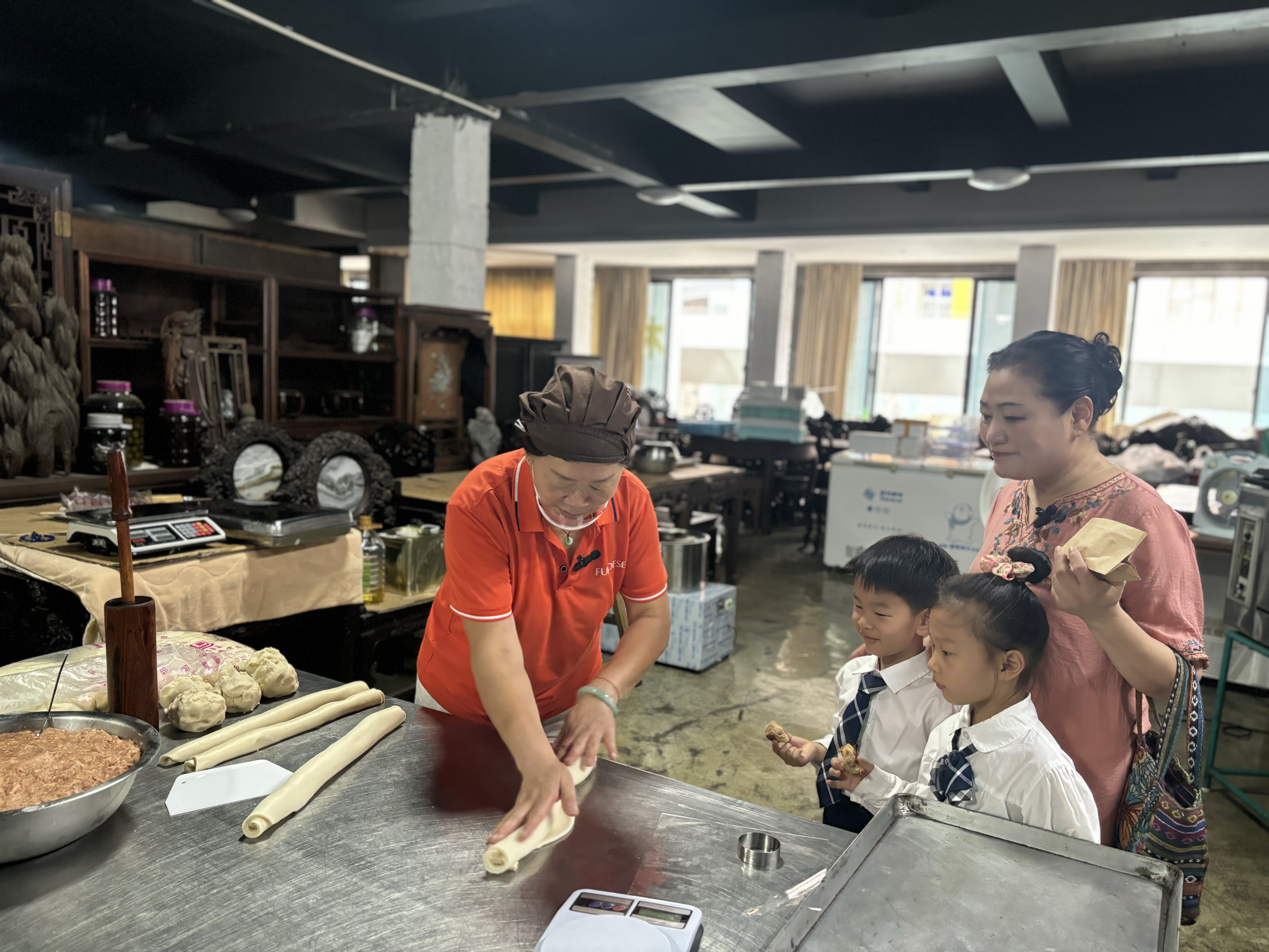 活动中,殷奶奶牵着囡囡们的手漫步精严寺街。大家首先来到奶奶常去的小吃店,品尝嘉兴特色肉月饼。老板递上刚出炉的肉月饼,孩子们捧着热乎乎的月饼,吹一吹小心品尝一口,纷纷感叹 “外皮好酥”“肉汁好鲜”。殷奶奶还向孩子们介绍,嘉兴肉月饼以 “现烤现吃” 闻名,新鲜猪肉搭配虾仁、榨菜,是刻在嘉兴人记忆里的中秋味道。随后,老板向囡囡们介绍肉月饼的制作过程。