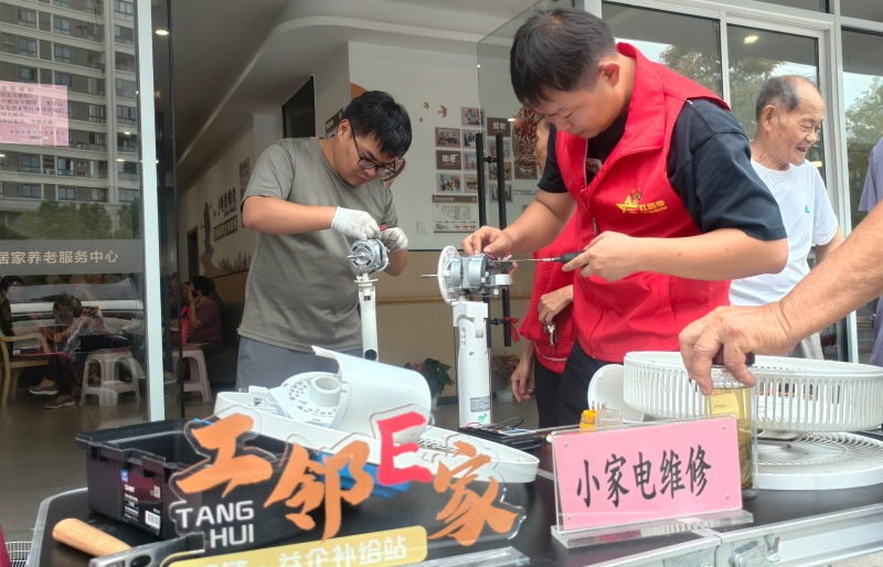 与此同时,舞台旁的“工邻E家”服务区同样人气十足。志愿者们以专业的技能和耐心的态度,为排起长队的居民提供了形式多样的暖心服务:理发、维修小家电、磨剪刀、牙科咨询等。现场还开展了涵盖垃圾分类、食药安全、医疗保险等内容的政策宣传,志愿者们用通俗易懂的语言为居民答疑解惑,将实用的政策和知识送到他们手中。