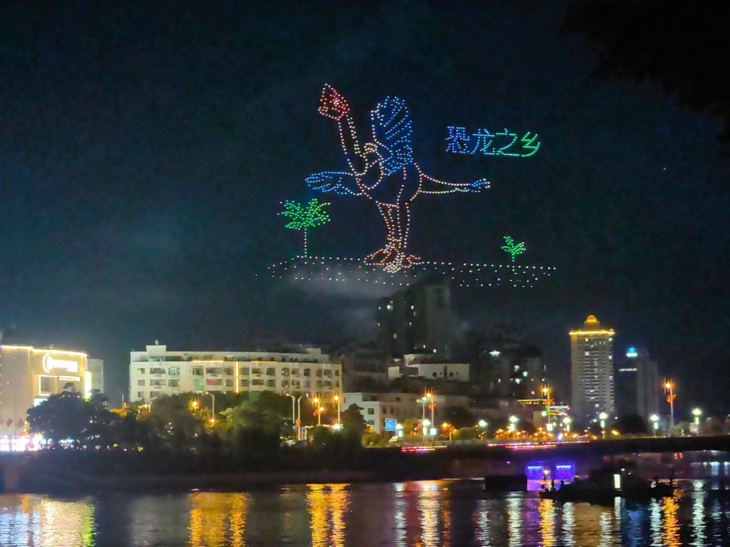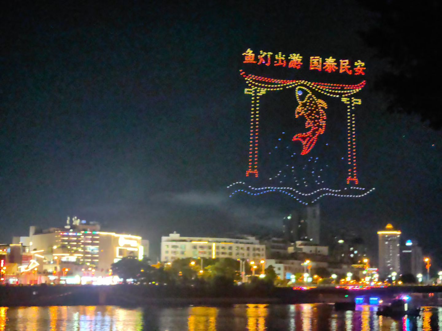 活动以客家文化为底蕴,以“鱼灯”为核心元素,精心策划了一系列精彩环节。夜幕下,主题曲《江湖渔火映河源》悠然响起,近20艘装饰一新的巡游船只如游龙般自珠河桥溯江而上,在江面划出粼粼波光,形成一道流动的水上风景线。与此同时,无人机编队、水上火壶、飞龙飞凤等特技表演点亮夜空,并与文化广场分会场绚烂的烟花表演交相辉映,呈现出一幅水火交融、流光溢彩的壮观图景。
