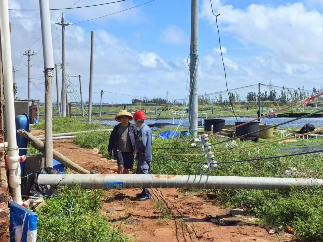 图为10月7日,河源市供电局抢修人员与受灾严重的虾塘养殖户沟通复电进度,安抚用户情绪(曾睿 摄)