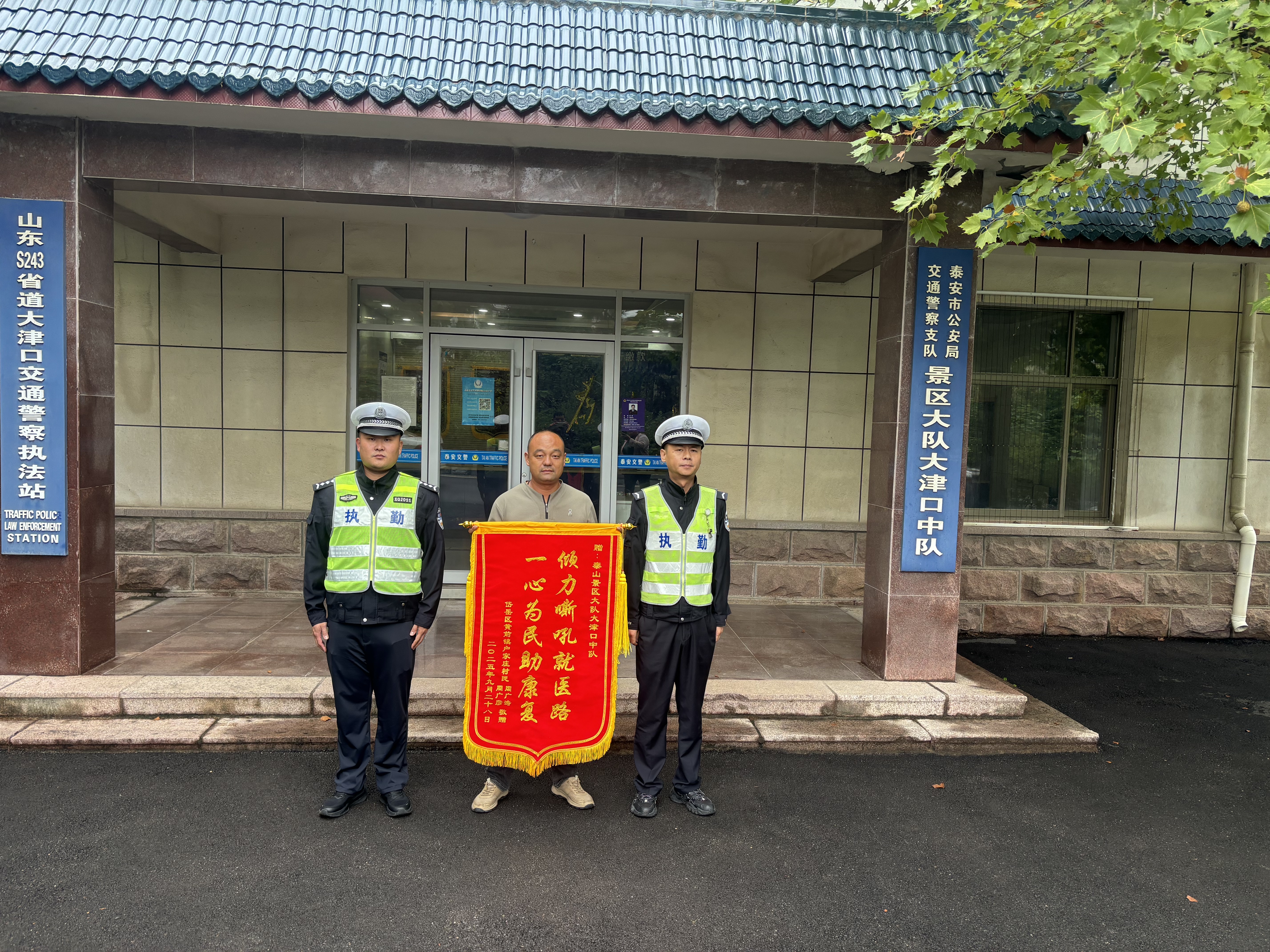 社区文化网(通讯员 王翔宇)10月7日上午,市民周先生将一面印有“倾力嘶吼就医路、一心为民祝康复”的锦旗送到泰安交警景区大队勤务二中队,对执勤人员的及时救助表示感谢。