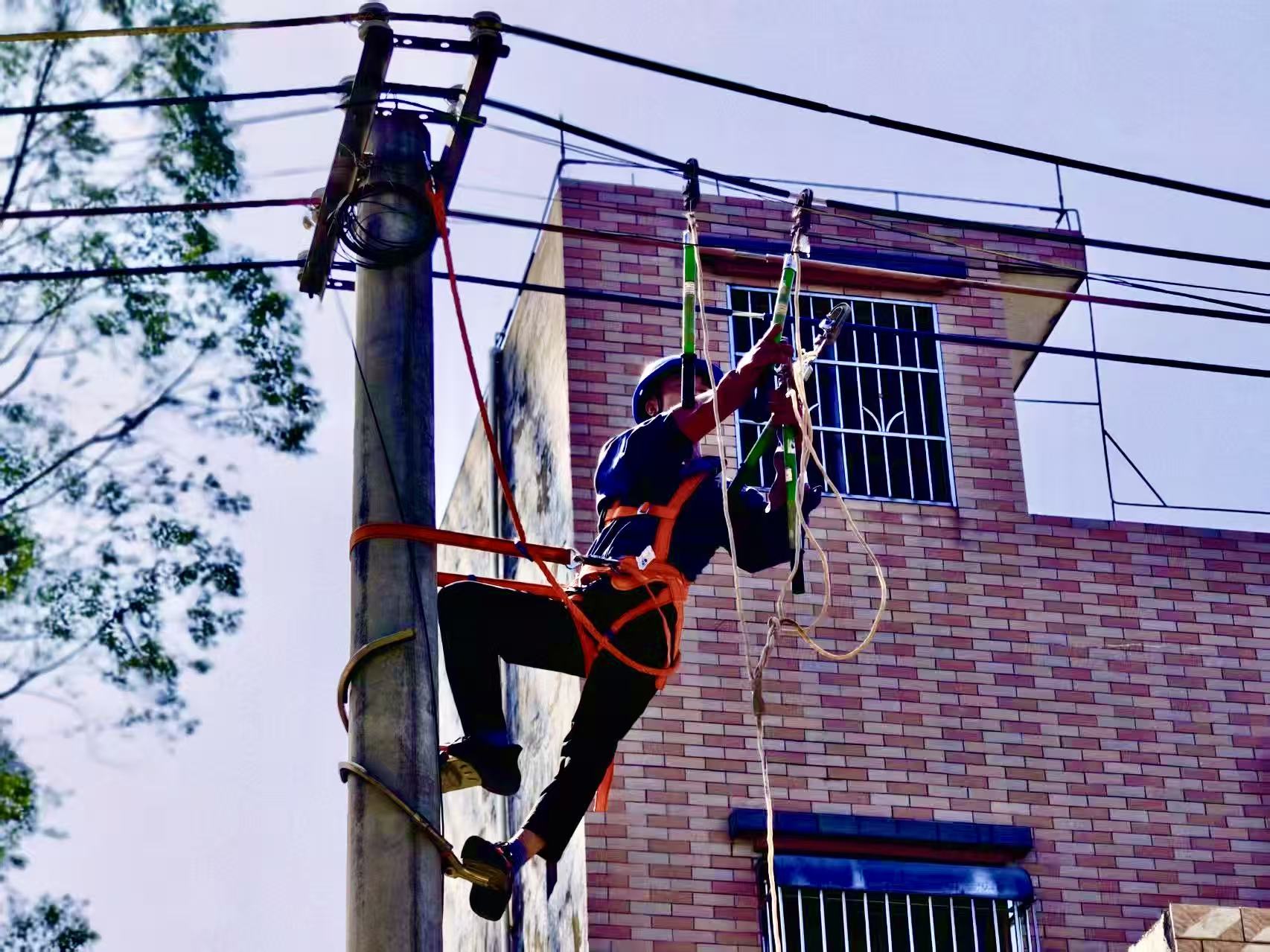 10月7日,南方电网贵州毕节供电局抢修人员正在架设10千伏芒溪线山家村委会变压器400伏低压线路,(杨祺 摄)