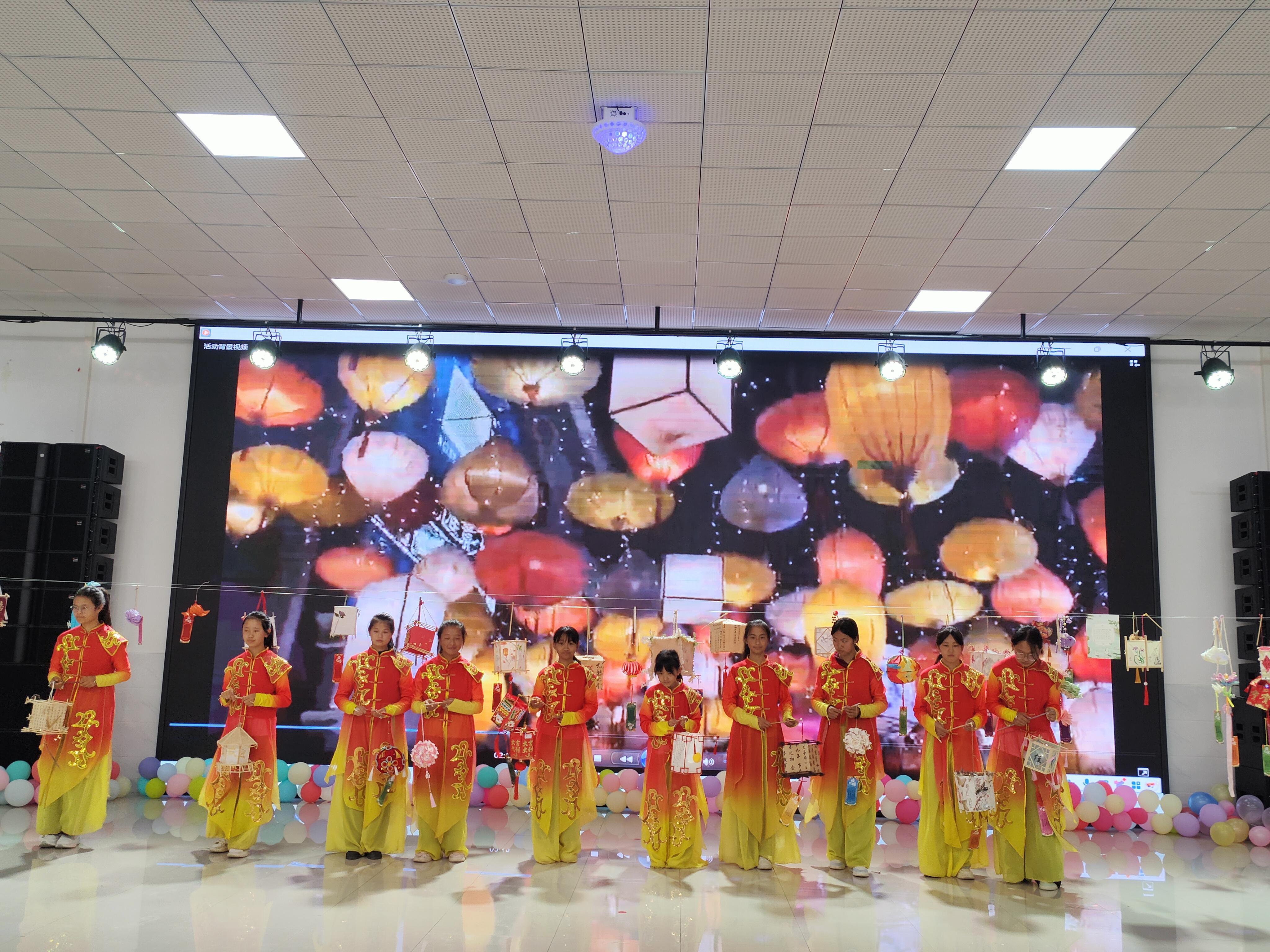 活动尾声,全体师生齐上台观赏灯笼,手中的灯笼与背景的国旗交相辉映。灯光映照下,“灯火映初心 家国共此时”的深切表现与师生们的笑脸相映成趣,构成一幅民族团结、家国同庆的美好画卷。