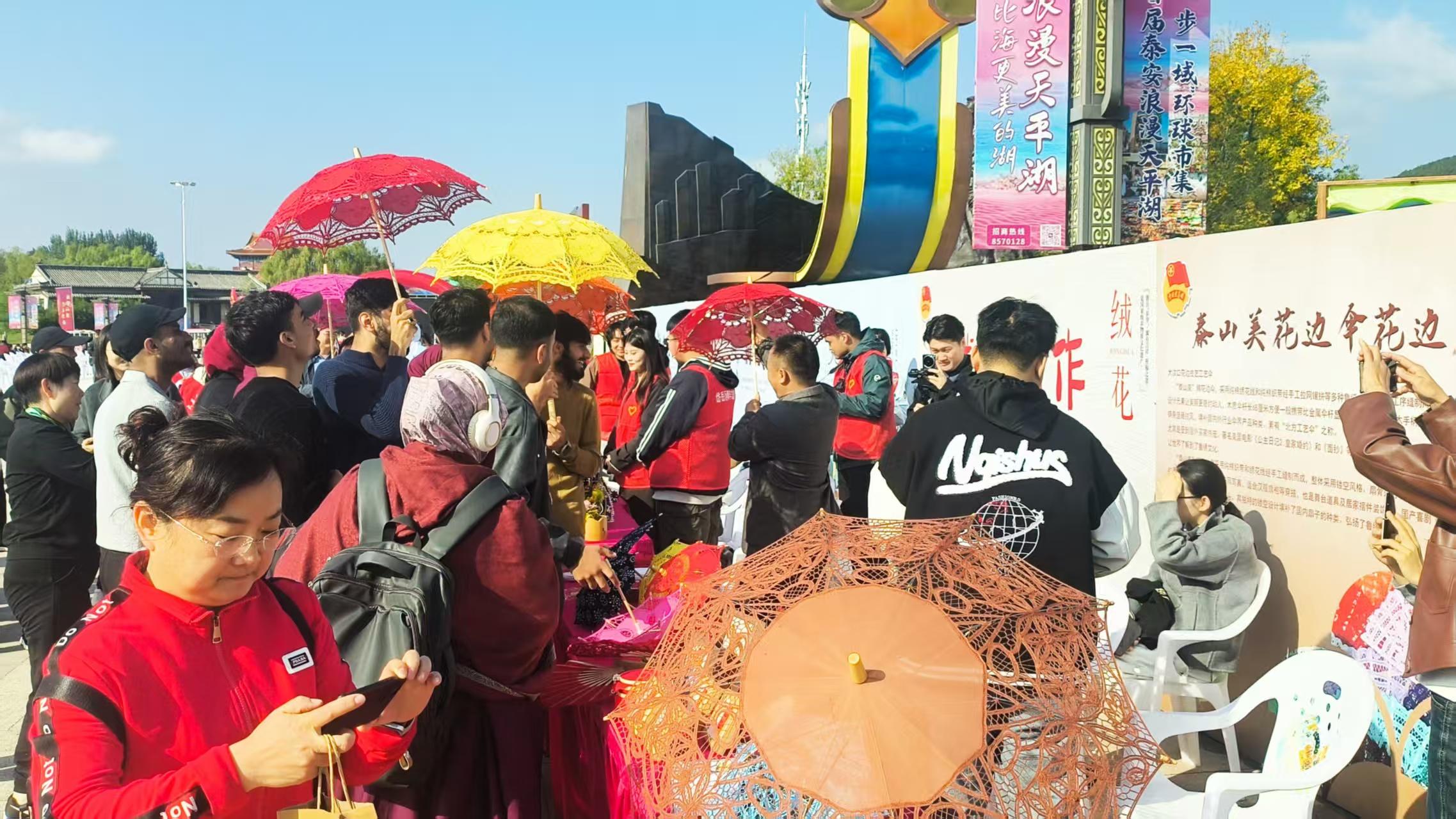 仪式上,青年志愿者宣读了新时代文明婚嫁倡议,岱岳区委社会工作部与区志愿服务联合会联合发起“微心愿”认领活动,新人自愿认领了志愿服务活动和项目。在活动现场,还设置了非遗文化体验区,提供剪纸、扎染、传拓、书法及胸花制作等互动项目,让新人与亲友沉浸式感受岱岳深厚的文化底蕴。在农产品展销区,展示了本地特色农产品,助力乡村振兴宣传,吸引了众多游客。