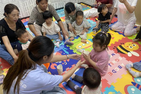 随后的《杯子传球》亲子游戏将活动气氛推向高潮。老师提前准备了一次性纸杯与彩色小球,并演示了游戏规则。“宝宝快看,小球要过来啦!”家长们耐心引导孩子专注观察球的传递轨迹,家长和孩子们接住小球接力运送,在协作中培养默契。这个低成本的小游戏不仅有效锻炼了宝宝的手眼协调能力与专注力,更在一次次传球与鼓励中,拉近了亲子间的心理距离,现场满是“加油”声与欢笑声。