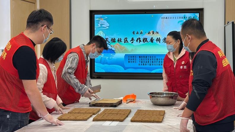 天佑社区党群服务中心弥漫着淡淡的米粉香气。大家配合默契,有条不紊地忙碌着。一双双巧手在米粉间翻飞,细细的米粉从筛网中簌簌落下;揉面的双手力度恰到好处,将温情与祝福一同揉进面团;入模时,粉团被小心翼翼地填入模具,轻轻压实……最后,在软糯的糕面上轻轻点上喜庆的红色印记。制作过程中,大家不忘践行垃圾分类,将废弃纸巾丢入“其他垃圾”桶,掉落的少量米粉碎末则收集进“厨余垃圾”桶。制作完毕后,重阳糕被送入蒸笼,不一会儿,甜香满屋,浓浓的敬老情谊也沁入人心。