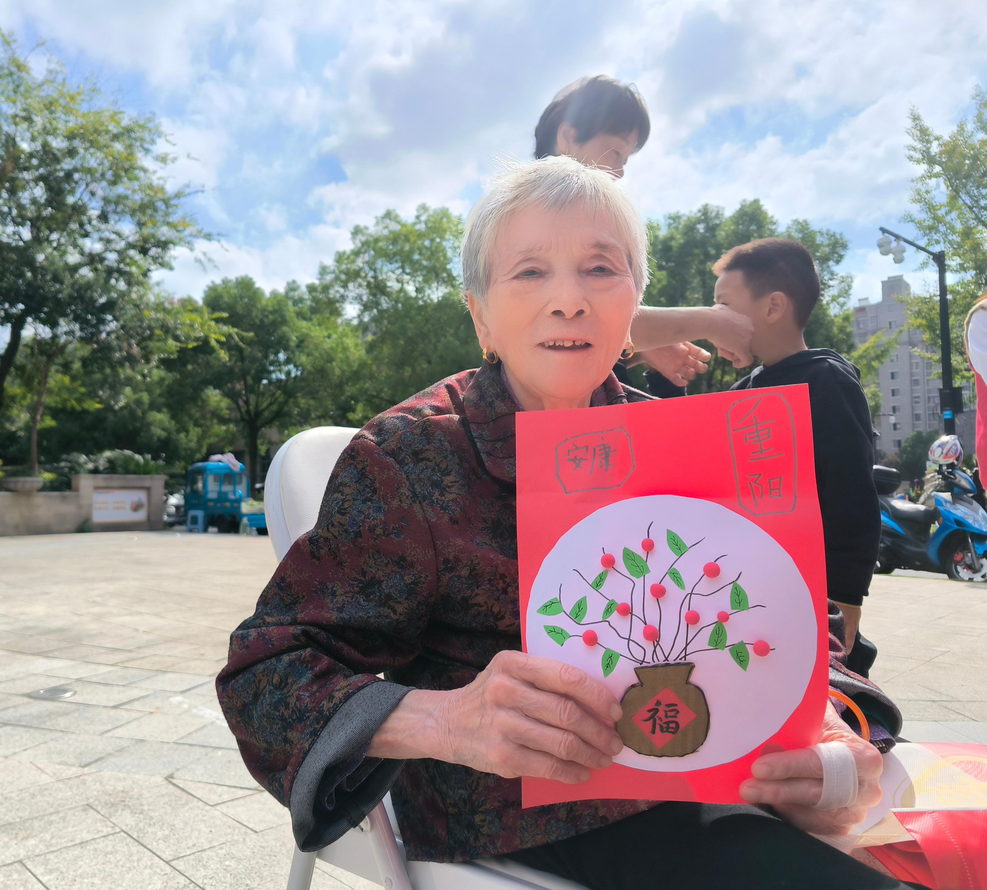 手工制作完成后,在社区志愿者的带领下,16 名 “爱心小使者” 来到隆兴公寓北区的小广场上。“爷爷奶奶,重阳节快到了!这是我们自己做的茱萸,祝您身体健康!” 孩子们一边甜甜地问候,一边将精心制作的茱萸递到老人手中。老人们接过这份特殊的节日礼物,脸上瞬间绽放出欣慰的笑容,并夸赞道:“这手工做得真好看,谢谢你们呀,孩子!”