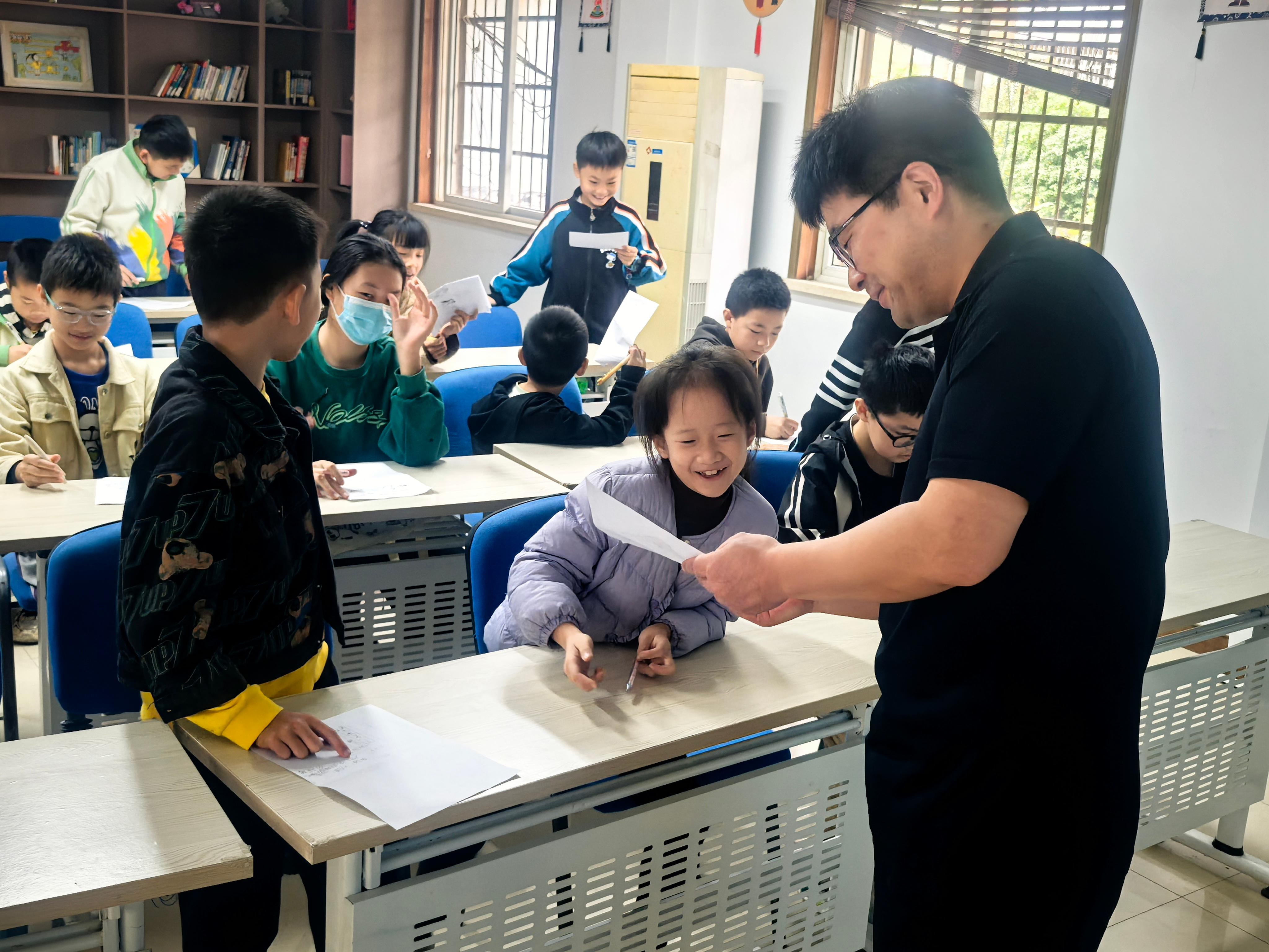 本次心理拓展课程通过游戏化设计,心理老师与孩子的深度互动,帮助青少年在安全环境中探索自我认知。课堂伊始,老师率先借助AI技术,为自己绘制出了一张“老年照”,引起了孩子们强烈的好奇心。随后孩子们依次上台体验自己的“老年照”,在孩子们分外惊讶的情况下,心理老师通过言语疏导,每个年龄都有独特的美来缓解孩子们的惊奇与害怕。并鼓励青少年将学习压力转化为成长动力,同时融入廉洁自律的价值观教育,使心理调适与品德养成同步提升。第二阶段,心理老师用“5 - 4 - 3 - 2 - 1感官着陆法”的小技巧,教会孩子们在情绪波动时快速回归当下,缓解焦虑。最后,孩子们拿起画笔、铺开信纸,认真描绘着心中的未来。与自己“签下”成长路上的“协议”,为未来,梦想奋斗。