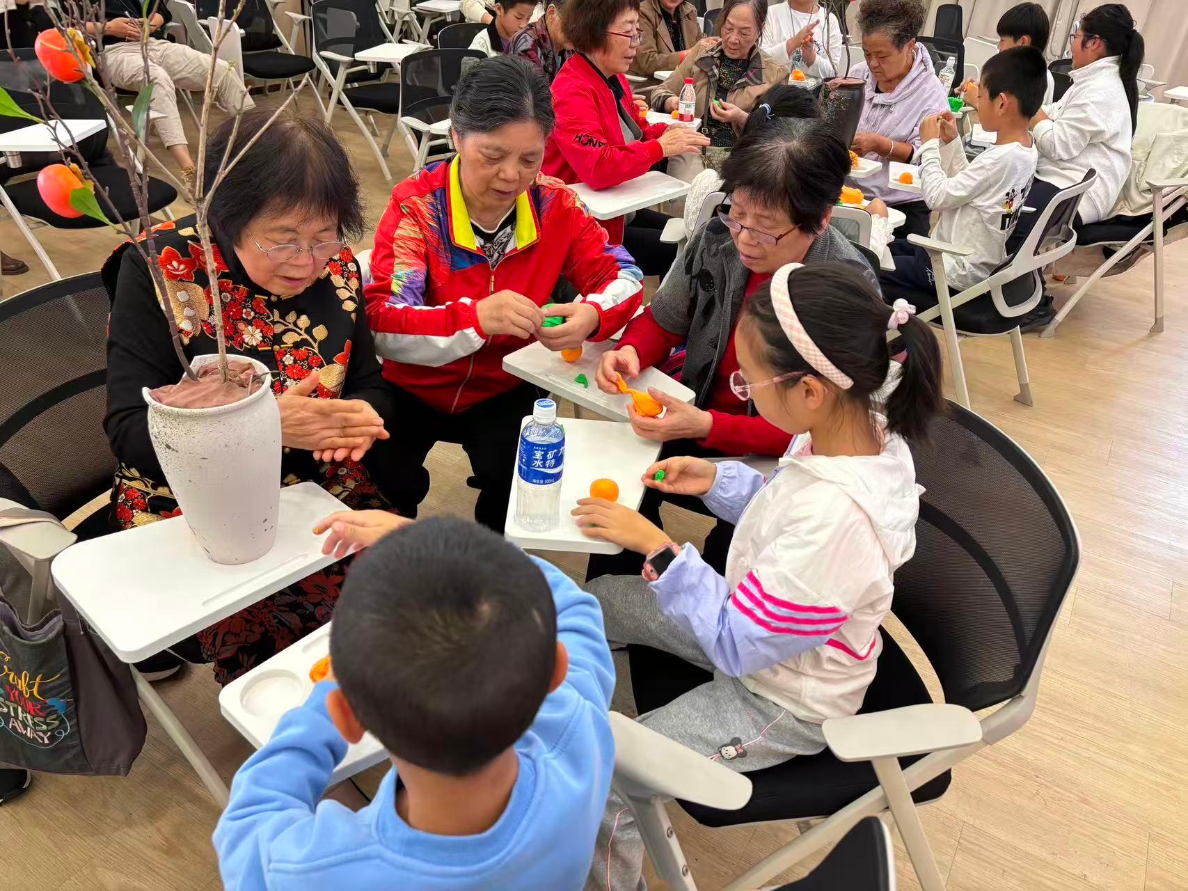 活动的最后环节是共同制作“柿子树花瓶”。在周老师的指导下,老人和孩子们结对成组,默契配合。老人们耐心细致地传授技巧,孩子们则发挥想象力,用灵巧的小手将一颗颗象征“事事如意”的粘土小柿子点缀在枝头。一老一少,相互协作,其乐融融。不一会儿,一盆盆红彤彤、充满童趣与祝福的柿子树手工作品便呈现在大家眼前。