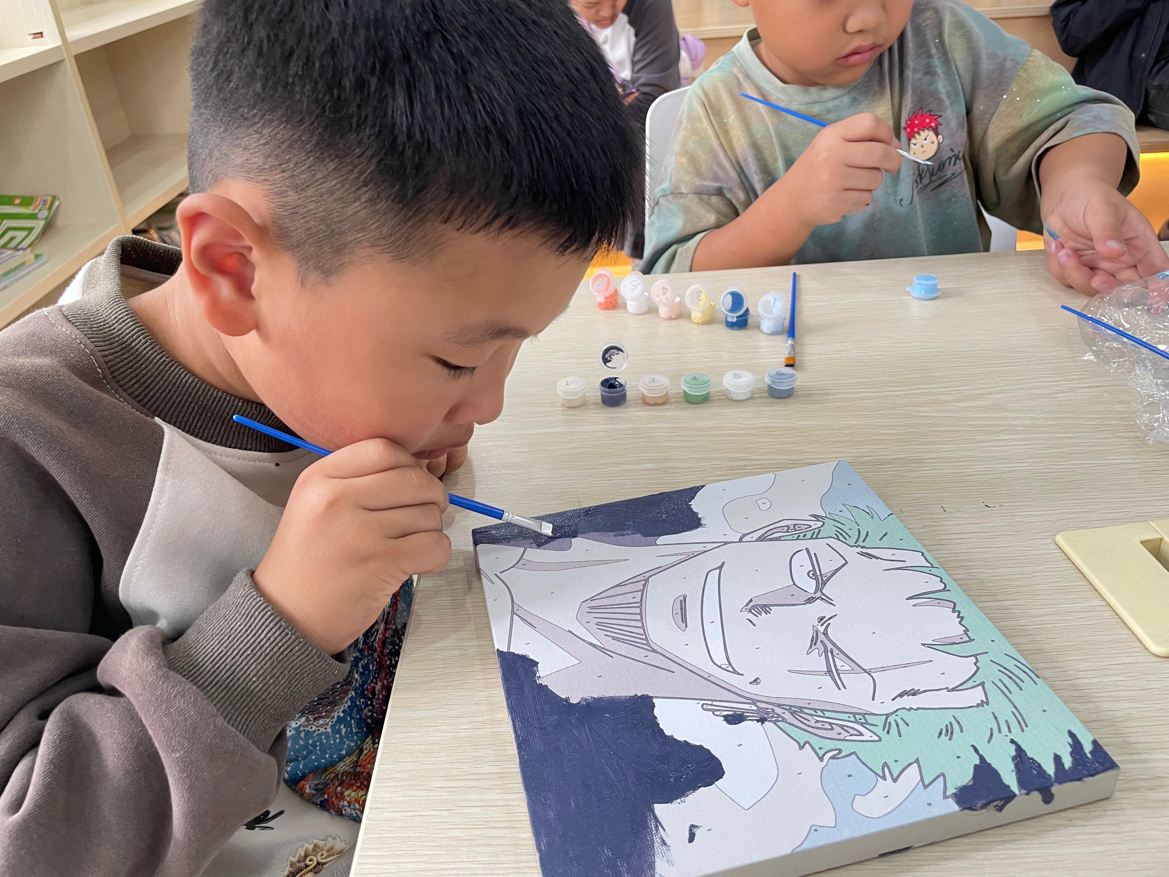 活动伊始,首先登场的是 “色彩奇兵” 颜料数字画创作环节。工作人员早已为每个家庭准备好印有数字标识的空白画布、调色盘与各色颜料,在家长的耐心引导下,孩子们化身“小小色彩奇兵”,全神贯注地投入到颜料数字画的创作中。根据不同数字对应的不同颜色,孩子们化身小小艺术家,认真填充每一块色彩。有的孩子专注地为画面中的“云朵”填充白色,有的则在家长的帮助下,小心翼翼地为心爱地卡通人物描边。过程中,不时有孩子举起画笔向家长请教:“妈妈,这里怎么画呀?” 家长们则温柔地回应,手把手地指导孩子握笔、上色。原本空白的画布,在亲子间的默契配合下,渐渐变得色彩斑斓,不仅成为了一幅幅绚丽的艺术佳作,也定格了亲子间共同创作的温馨瞬间。