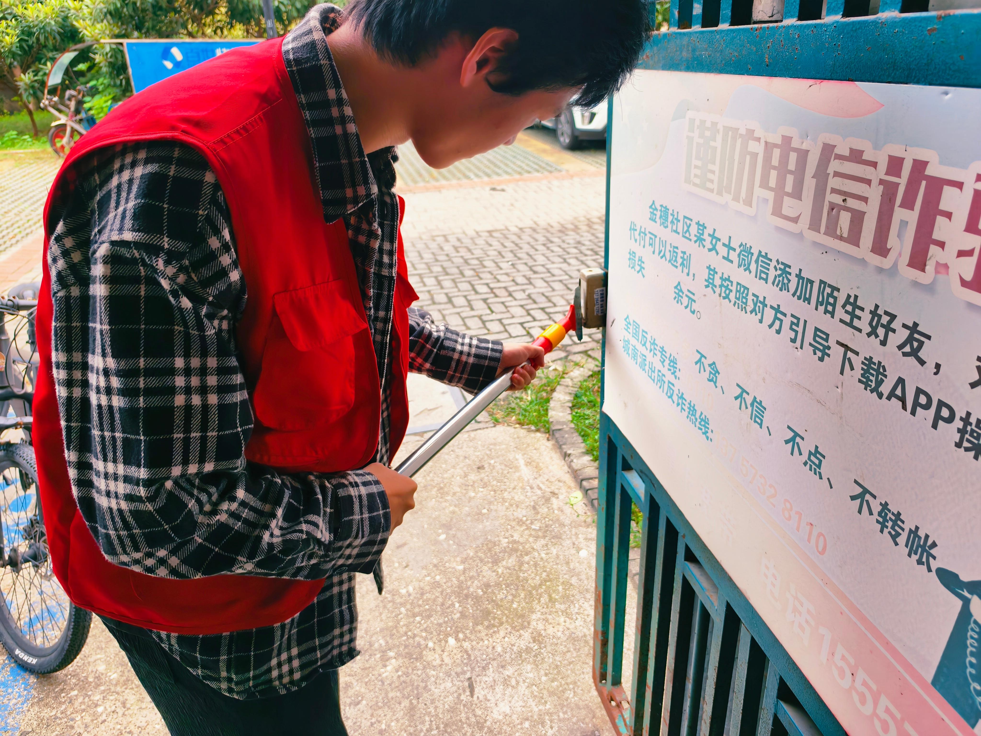 另一边,志愿者们手持铲除工具,在月亮湾小区的围栏、公告栏等区域,对各类违规小广告进行集中清理。他们仔细铲除每一处张贴的小广告,不放过任何一个角落。在铲除过程中,志愿者们还向周边居民宣传乱贴小广告对生态环境和社区美观的不良影响,倡导大家共同维护整洁的居住环境。