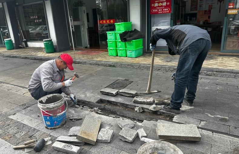 针对排查出的20余处分散破损点,社区采取“精准定位、快速修补”的“零星维修”策略,有效避免大面积施工对商户经营和居民生活的干扰。施工队伍依据清单逐点作业,高效完成破碎、清理、铺设与压实等工序,以最小影响实现最优修复。