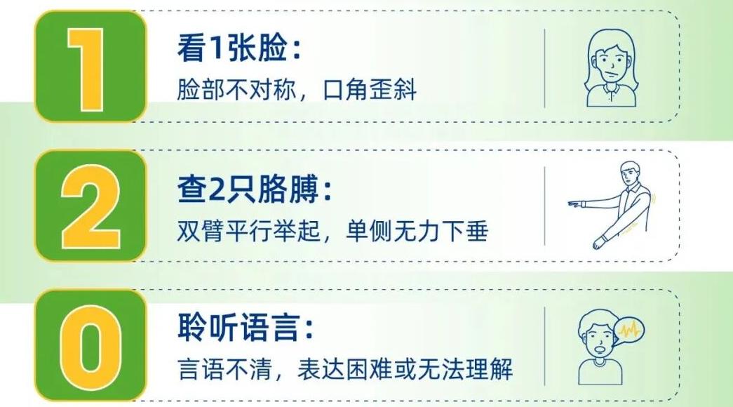 在此特别提醒广大市民:积极掌握 “中风 120” 口诀 ——“1” 看一张脸是否对称,“2” 查两只手臂抬起是否单侧无力,“0” 听讲话是否清晰,用科学方法守护大脑健康,践行健康生活方式!