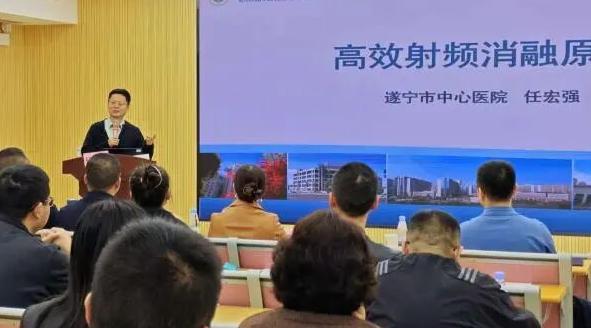 《射洪区域心脏介入治疗培训班》中,遂宁市中心医院任宏强主任讲解《高效射频消融原理》;绵阳市中心医院周刚医师分享《经导管心脏瓣膜病介入治疗》前沿技术;绵阳市科学城医院王栏霖医师解析《慢性完全闭塞病变(CTO)介入治疗新进展》;四川大学华西医院蒲小波博士结合案例报告《快速性心律失常与导管消融》。射洪市中医院吴峰、胥皓、张波医师,还分别讲解《稳定性冠心病诊治》《心脏起搏器的应用》《冠脉介入诊疗并发症及处理》,展现该院专业积累。