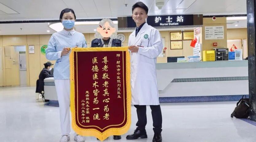 因韩大爷带有气切装置,射洪市中医院外一科医护团队合力精细护理,最终使其指标稳定、达到出院标准。患者女儿为刘亮医生及医护团队送上锦旗,以此致谢,更见证了医患同心、共克病魔的温暖历程,闪耀着医学的温度与人性的光辉。
