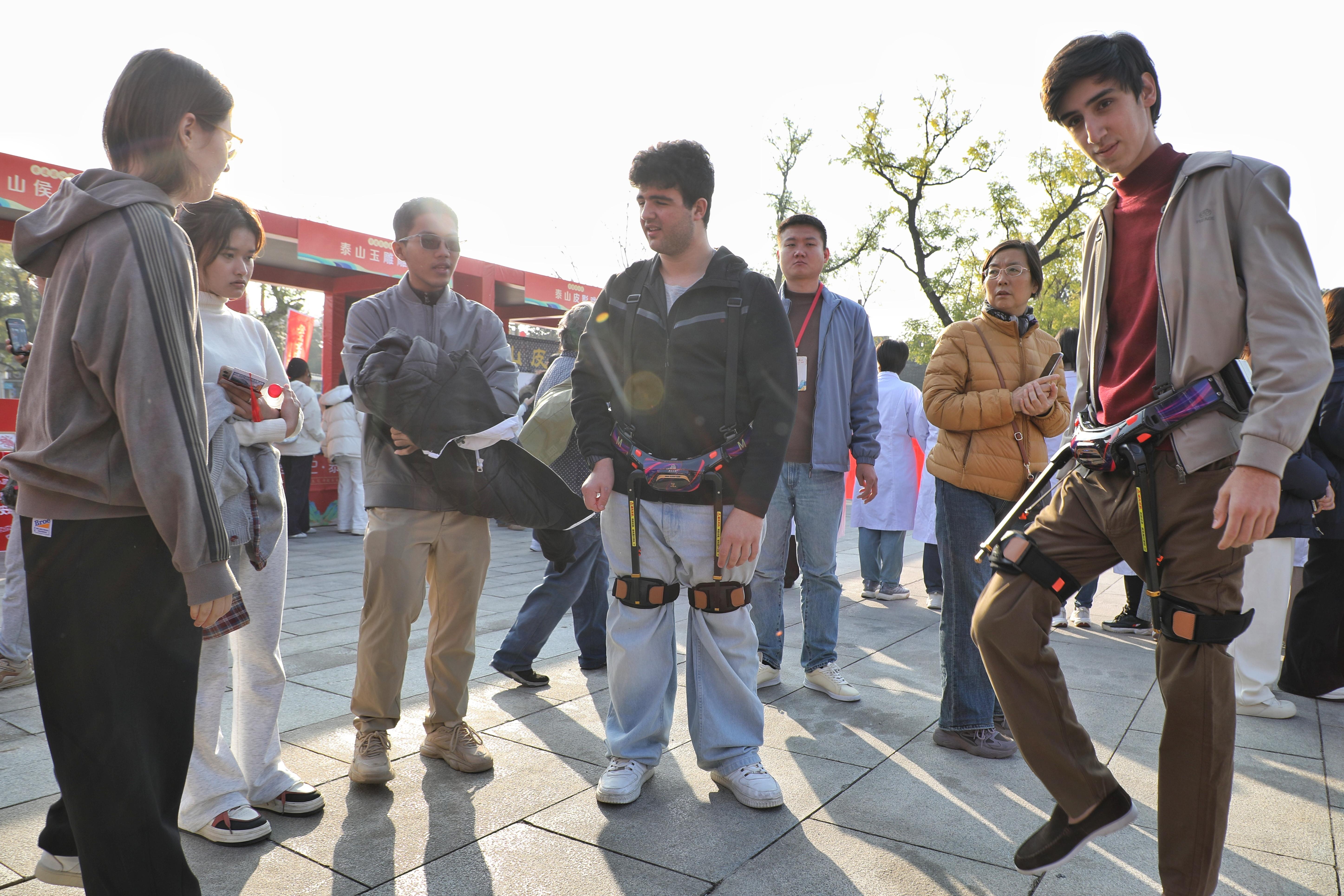 非遗匠心区,泰山皮影戏、玉雕雕刻等非遗展台前围满游客,豆腐传统制作技艺(国家级)非遗项目匠人带来“家伙什”,市民、游客亲手制作豆腐,现场豆香四溢。权益保障区里,老人通过反诈小游戏学习防骗知识,连连惊叹。敬老义诊区,医疗团队正为老人测量血压、提供健康咨询。泰山文旅集团工作人员演示的登山助力机器人让老人们啧啧称赞。广场另一侧,机器狗表演引得孩子们阵阵欢呼,舞狮队随鼓乐腾挪出特有的精气神,百人太极刚柔并济显露真功夫——节日的广场,处处“闪银光”。
