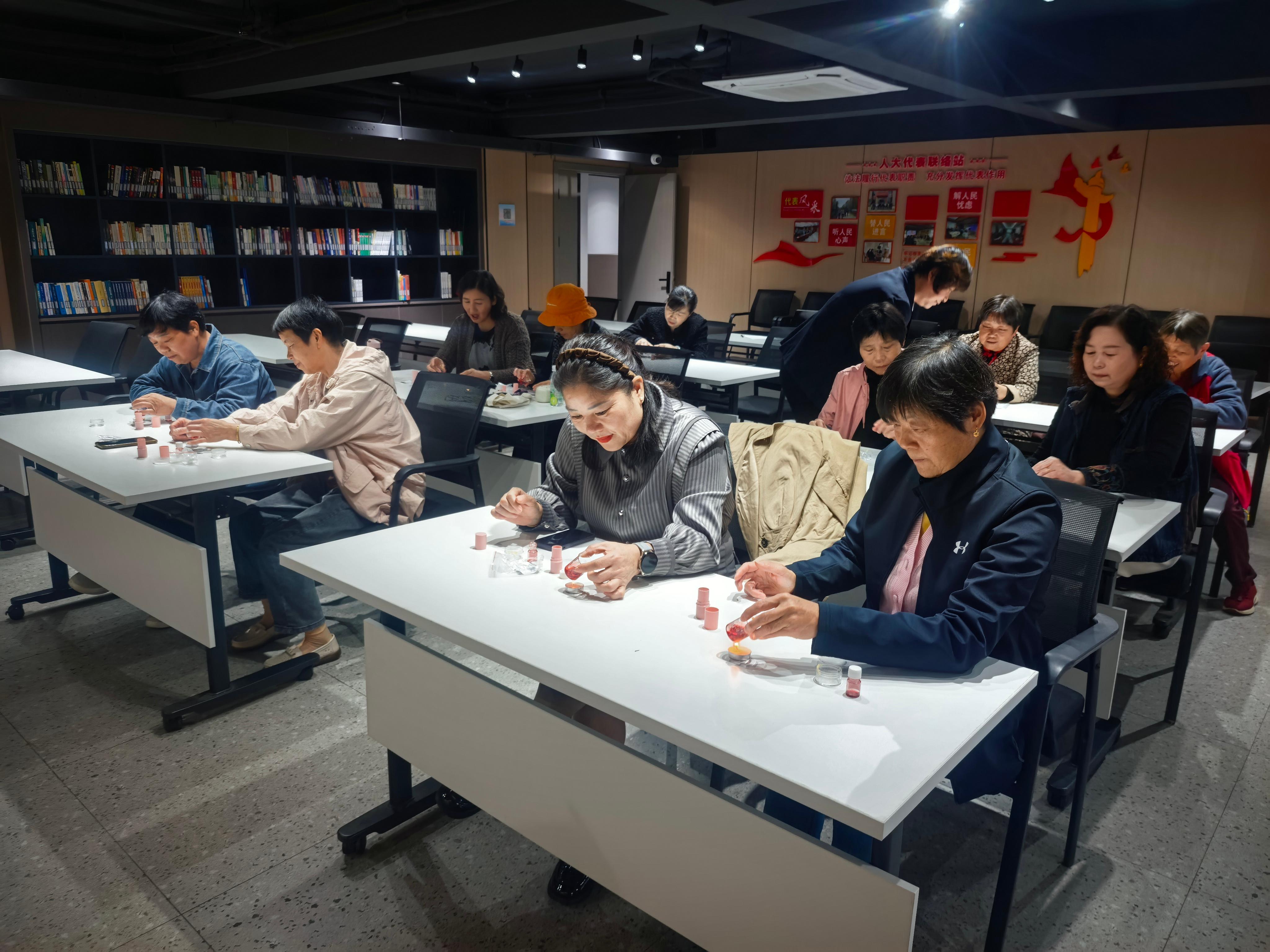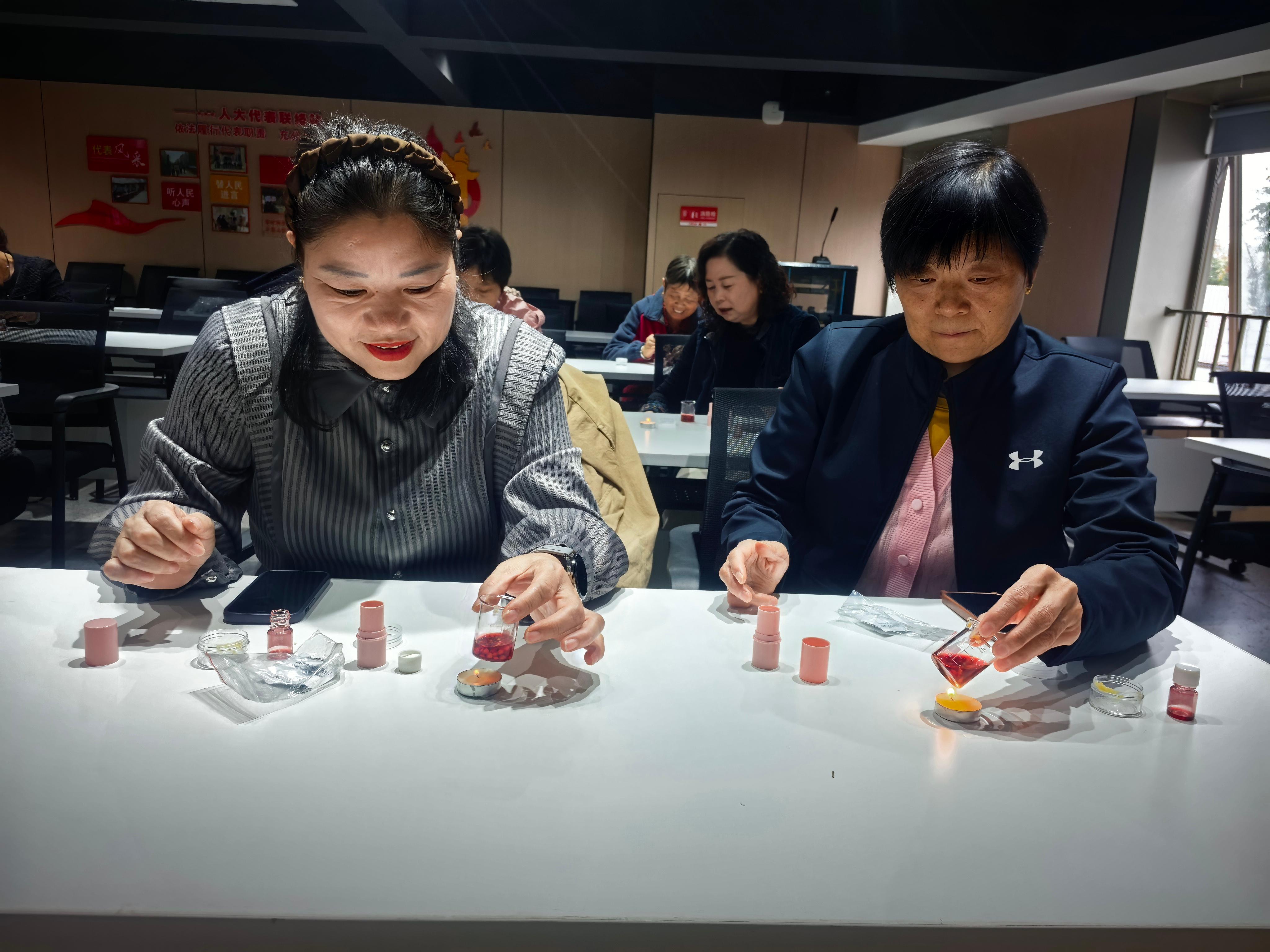 活动伊始,工作人员向老人们介绍了艾草的功效:“艾草是咱们生活中常见的草药,能驱寒祛湿、缓解蚊虫叮咬后的瘙痒,做成艾草膏方便携带,平时涂抹很实用。”随后,大家拿出提前准备好的材料——现成的艾草汁、蜂蜡、橄榄油等,工作人员演示起制作步骤:先将蜂蜡用小蜡烛隔火融化,加入橄榄油搅拌均匀,再倒入艾草汁充分混合,最后将混合好的液体倒入小罐子里冷却凝固,一根类似口红的塑料胶管的艾草膏就初具雏形。