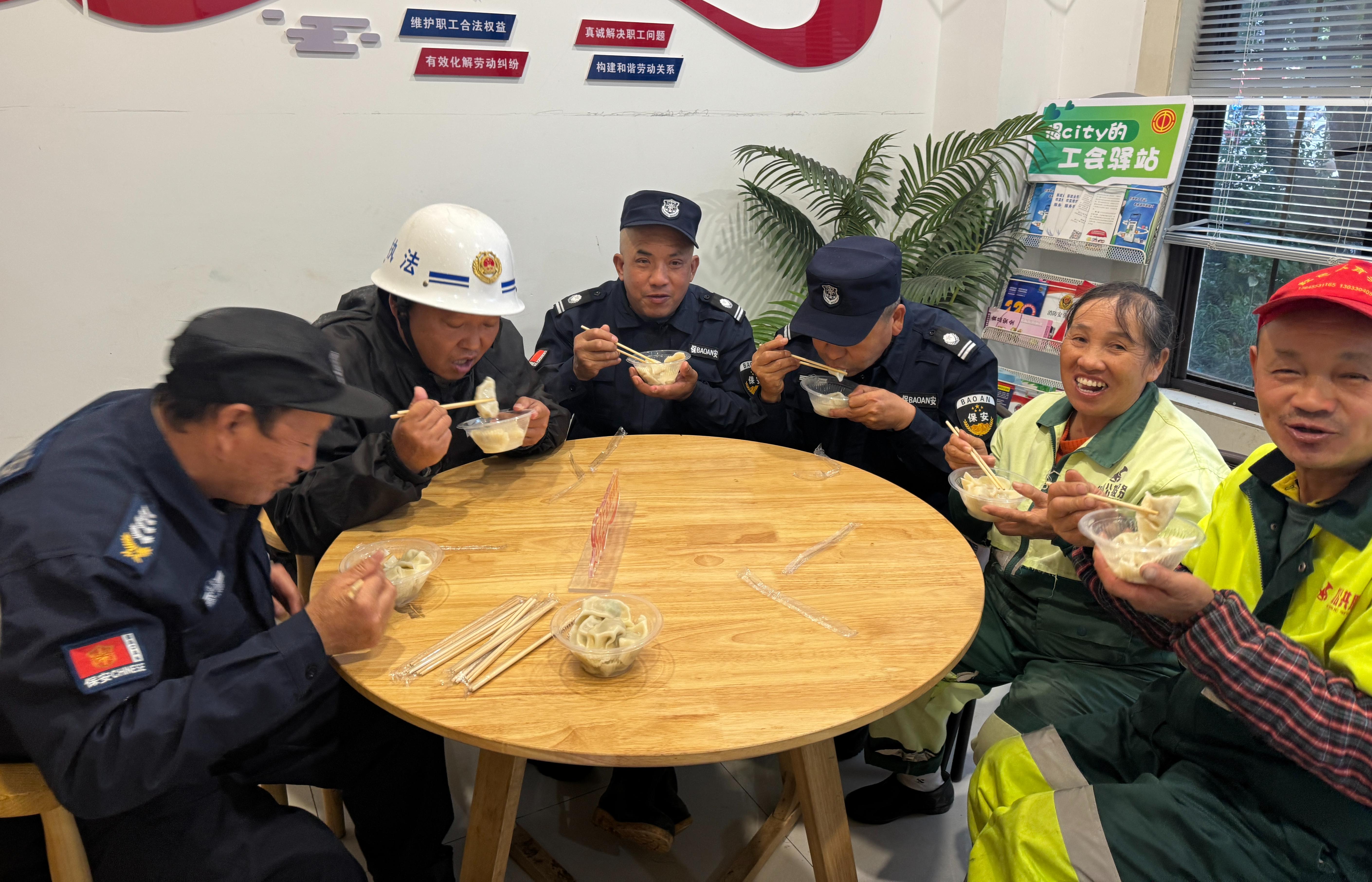 立冬节气很多地方都有吃饺子的习俗。为了让户外工作者们吃上一口家乡味,活动后社区工会工作者将煮好的一碗碗热气腾腾的饺子端上桌。大家一边吃着饺子,一边感受着这份来自社区的温暖。冬日的寒意,在这温暖的氛围中渐渐退去,彼此之间的距离也在这一碗碗饺子中变得更加亲近。最后,社区还为每一位到场的户外工作者送上了安全头盔,让他们在暖冬时为自身安全增加了一份保障。