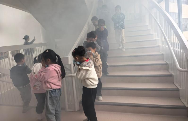 知识讲解结束后,应急逃生演练正式启动。随着模拟火灾警报声响起,幼儿园内迅速弥漫起模拟烟雾,各班老师立即按照预设逃生路线,沉着有序地组织幼儿用湿毛巾捂住口鼻,弯腰低姿,避开烟雾区域,沿着墙壁快速向操场安全区域疏散。过程中,孩子们听从指挥、不推不挤,在老师和救援队教官的引导下,仅用3分钟便全部安全撤离至指定地点。随后,各班老师迅速清点人数并上报,确保无一名幼儿遗漏,整个逃生演练紧张有序、环环相扣,达到了预期效果。
