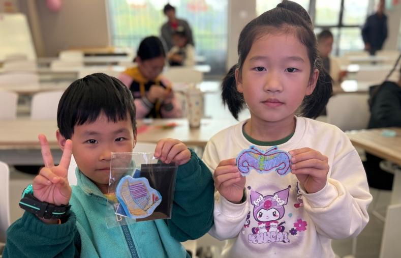 绣品完成后,在家长的协助下,孩子们用现场提供的配件和工具,将刺绣作品组装成精致的冰箱贴,让指尖的创意变成了可以珍藏的生活小物件,完成了一场趣味十足的作品变装秀。